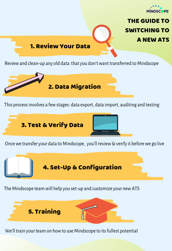 Truthfully, it doesn’t have to be that way—especially when you choose a vendor that has several years of experience of handling data migrations. At Mindscope, we’re sure that you’ll feel more confident about switching to a new applicant tracking system when you understand each stage that’s involved. We’ll walk you through the different stages you should expect to go through once you’ve committed to getting a new ATS.