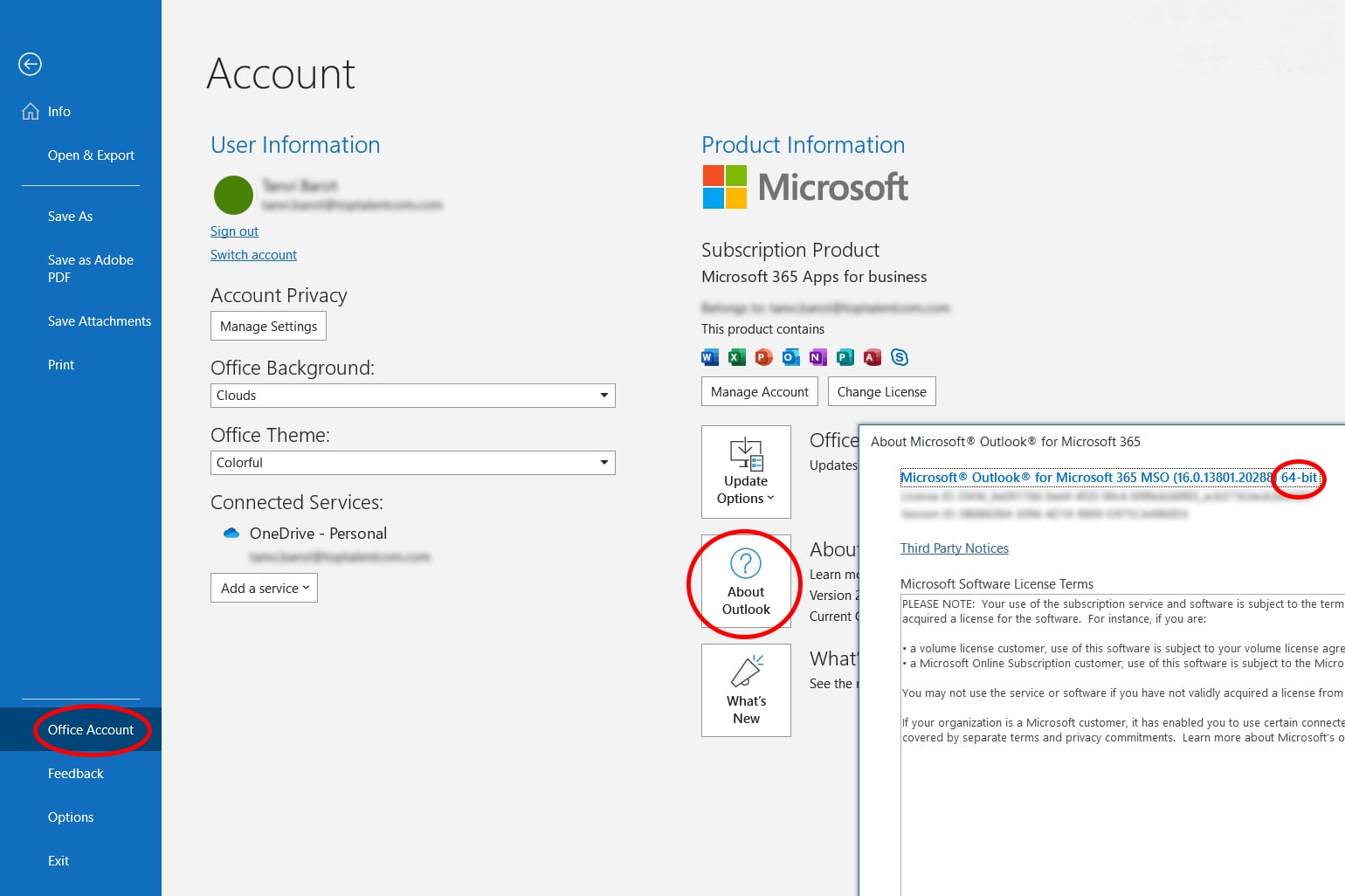In your Outlook, select “File” > “Office Account” > “About Outlook” to get your BIT version.